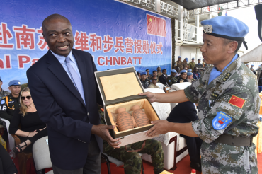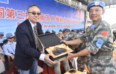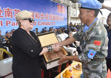 聯(lián)南蘇團維和部隊向國際友人贈彩陶助和諧