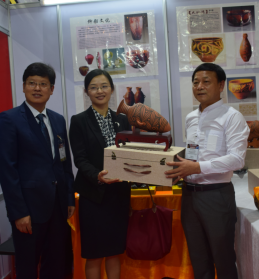 中國(guó)駐泰國(guó)大使館參贊煅煉女士親臨展會(huì)現(xiàn)場(chǎng),并收藏了劉新安制作的彩陶代表作《小口尖底瓶》